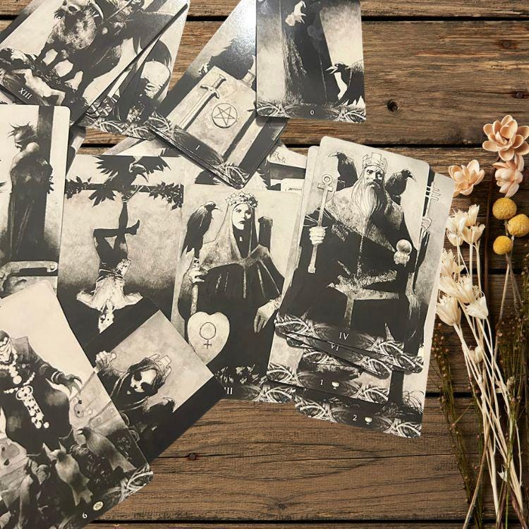 Illustrated entirely in powerful black-and-white artwork by Italian artist Corrado Roi, this deck strips tarot down to its emotional core. Each card feels like a whispered prophecy—haunting, symbolic, and deeply evocative. Whether used for shadow work, intuitive readings, or collector admiration, this deck delivers clarity through darkness.